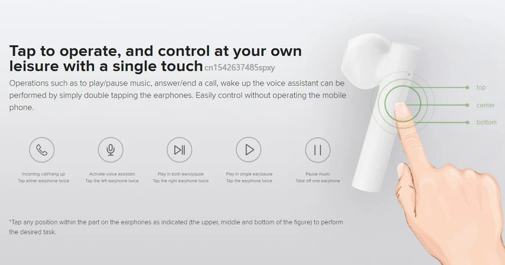 Сенсорное управление, управление одним касаниемПрикоснитесь к гарнитуре, чтобы реализовать воспроизведение музыки/пауза, ответить на вызов/повесить трубку, помощник по пробуждению голоса и другие операции. Можно легко управлять без использования мобильный телефон, что является простым и удобным.Входящий вызов/зависание: дважды нажмите на любую сторону гарнитурыФункция голосового ассистента: дважды нажмите на левую гарнитуруБинауральная воспроизведение/пауза: дважды нажмите на правый наушникMono Ear Play / Pause: дважды нажмите на гарнитуруМузыкальная пауза: Удалите любые наушники* Сенсорная часть гарнитуры может быть тронута в любом положении в области (верхняя, средняя и нижняя).