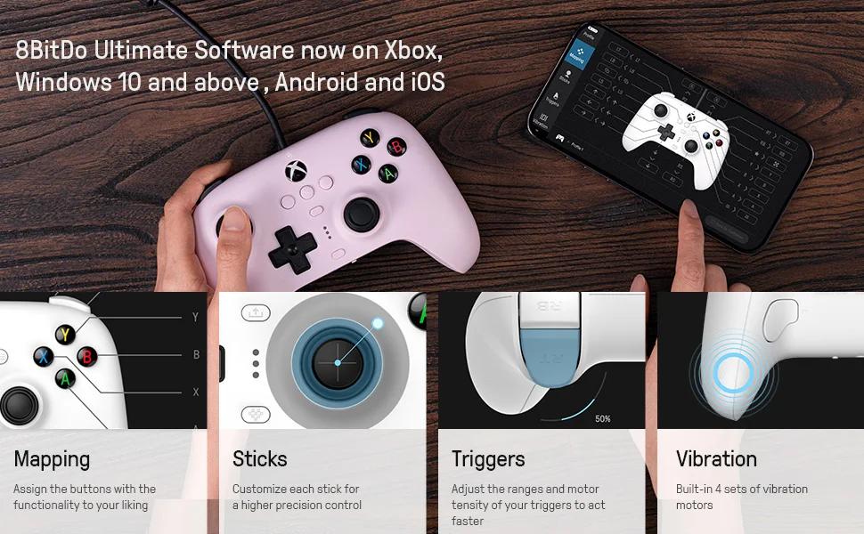 Превосходное управление, стиль и производительность по отличной цене. Настройка отображения кнопок, чувствительности джойстика и триггера, виброконтроля и многого другого с программным обеспечением 8BitDo Ultimate на Xbox Series X/S, Xbox One, Windows, iOS и Android.