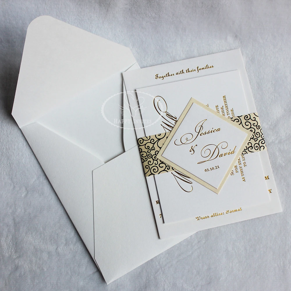 На заказ простой белый цвет приглашение на свадьбу карта 600gsm хлопок бумага с золотой фольгой Бланк цена по прейскуранту завода, пользовательские свадебные пригласительные карты с английский и китайский языки розовый дизайн черный и золотой фольги текст, классические белые текстурированные бумажные свадебные открытки с черным и золотым буквенным принтом в конверте, Свадебные открытки на заказ, изготовленные из белой хлопковой бумаги с черно-золотой печатью, красивый дизайн, цвета на выбор, свадебные приглашения на заказ в белом цвете с печатью на заказ в золотой фольге и черном цвете
