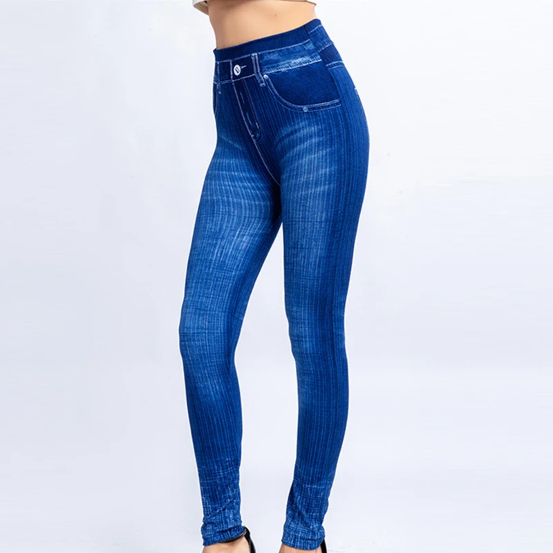 Высокая талия искусственная Джинсы Леггинсы Узкие эластичные бесшовные обтягивающие узкие брюки женские карманные тренировочные Леггинсы для бега