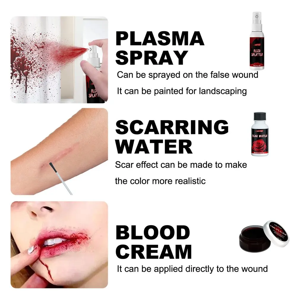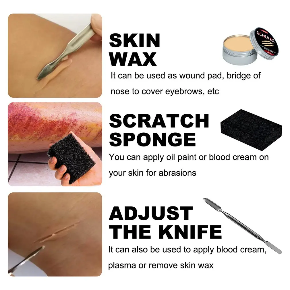 Посылка включает в себя: воск для шрамов + поддельный гель для крови + шрамовая вода + спрей для крови + 3 * губка + серебряный скребок