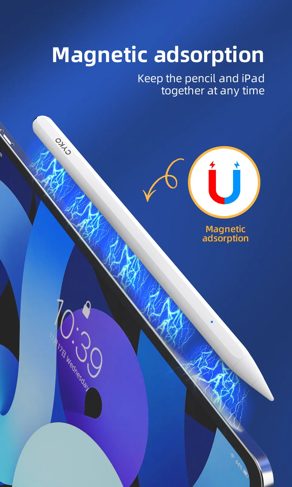 Карандаш CYKO можно магнитно прикрепить к ipad, чтобы ваш карандаш было нелегко потерять. Там, где iPad, там и карандаш. Хранение более удобное.