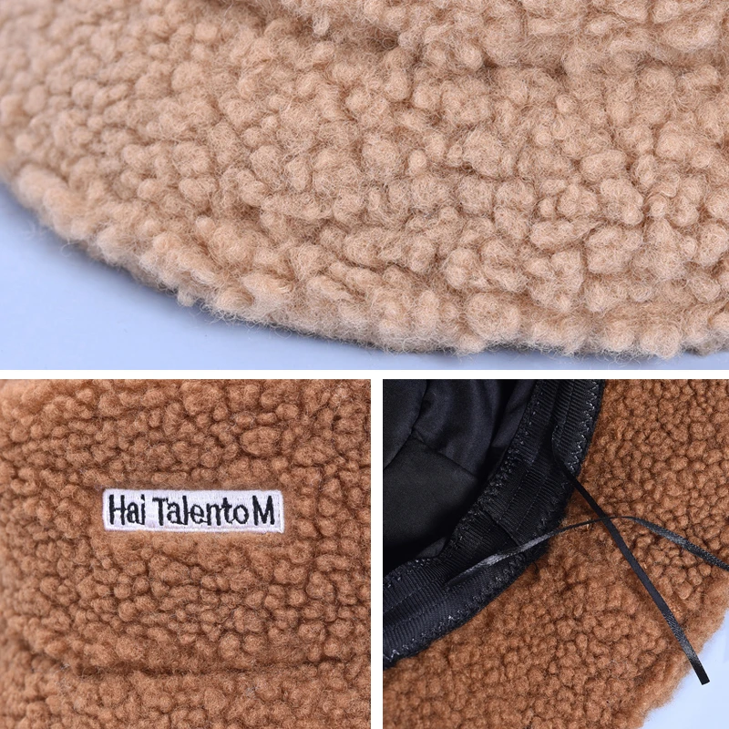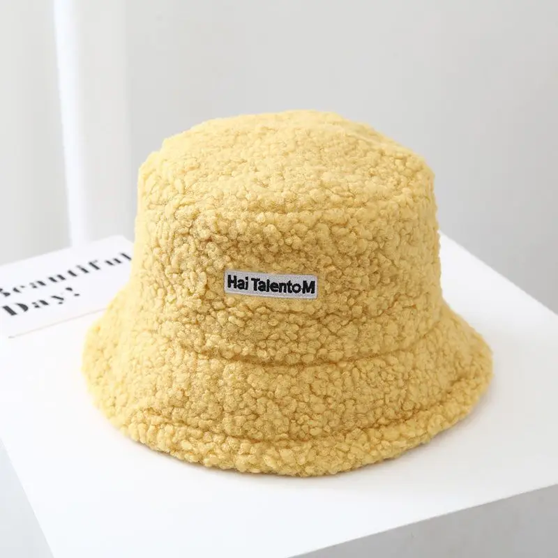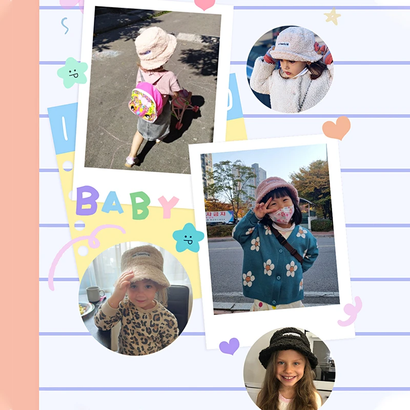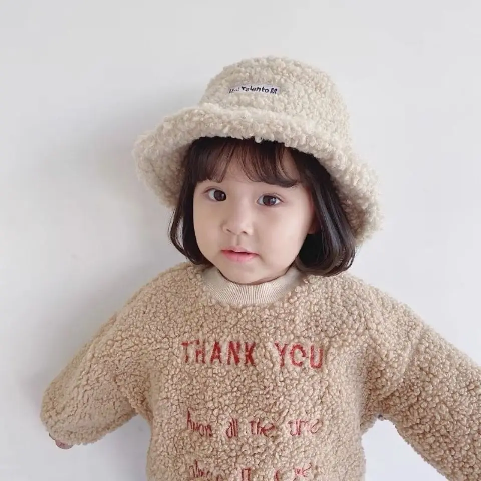 Lamb Wool Winter Baby Girl Boy Bucket Hat Cute Letter Kids Fisherman Caps Solid Flat Top Children Outdoor Thick Warm Sun Cap
