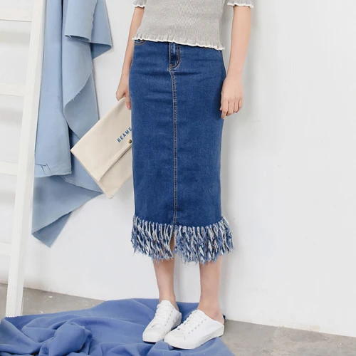 Джинсовая юбка 2017 корейская мода рваная кисточка с завышенной талией синяя джинсовая юбка винтажная длинная юбка-карандаш Faldas Saia feminina B110