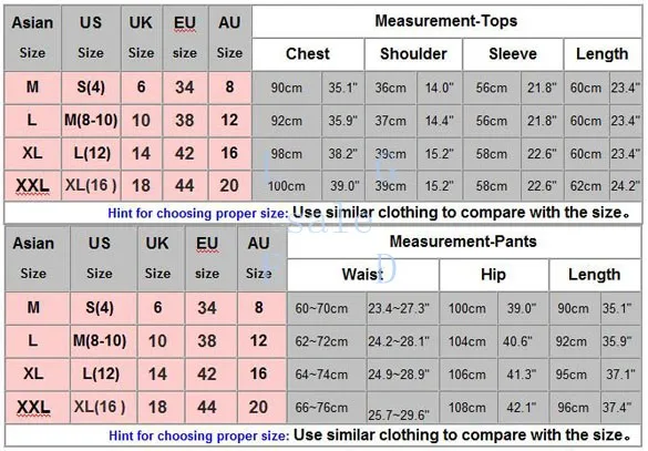 Size: There are three sizes (M, L, XL and XXL) available for the following listing. please allow 1-2cm differs due to manual measurement, thanks (All measurement in cm and please note 1cm=0.39inch) NOTE: Please compare the detail sizes with yours before you buy!!! | Asian Size | US Size | UK Size | EU size | AU Size | Measurement-Tops | | Chest | Shoulder | Sleeve | Length | | M | S(4) | 6 | 34 | 8 | 90cm | 35.1" | 36cm | 14.0" | 56cm | 21.8" | 60cm | 23.4" | | L | M(8-10) | 10 | 38 | 12 | 92cm | 35.9" | 37cm | 14.4" | 56cm | 21.8" | 60cm | 23.4" | | XL | L(12) | 14 | 42 | 16 | 98cm | 38.2" | 39cm | 15.2" | 58cm | 22.6" | 60cm | 23.4" | | XXL | XL(16 ) | 18 | 44 | 20 | 100cm | 39.0" | 39cm | 15.2" | 58cm | 22.6" | 62cm | 24.2" | | Hint for choosing proper size: Use similar clothing to compare with the size. | | Asian Size | US Size | UK Size | EU size | AU Size | Measurement-Pants | | Waist | Hip | Length | | M | S(4) | 6 | 34 | 8 | 60~70cm | 23.4~27.3" | 100cm | 39.0" | 90cm | 35.1" | | L | M(8-10) | 10 | 38 | 12 | 62~72cm | 24.2~28.1" | 104cm | 40.6" | 92cm | 35.9" | | XL | L(12) | 14 | 42 | 16 | 64~74cm | 24.9~28.9" | 106cm | 41.3" | 95cm | 37.1" | | XXL | XL(16 ) | 18 | 44 | 20 | 66~76cm | 25.7~29.6" | 108cm | 42.1" | 96cm | 37.4" | | Hint for choosing proper size: Use similar clothing to compare with the size. | 1. Use similar clothing to compare with the size. 2. Choose larger sizes if your size are same as the flat measurement Size chart -