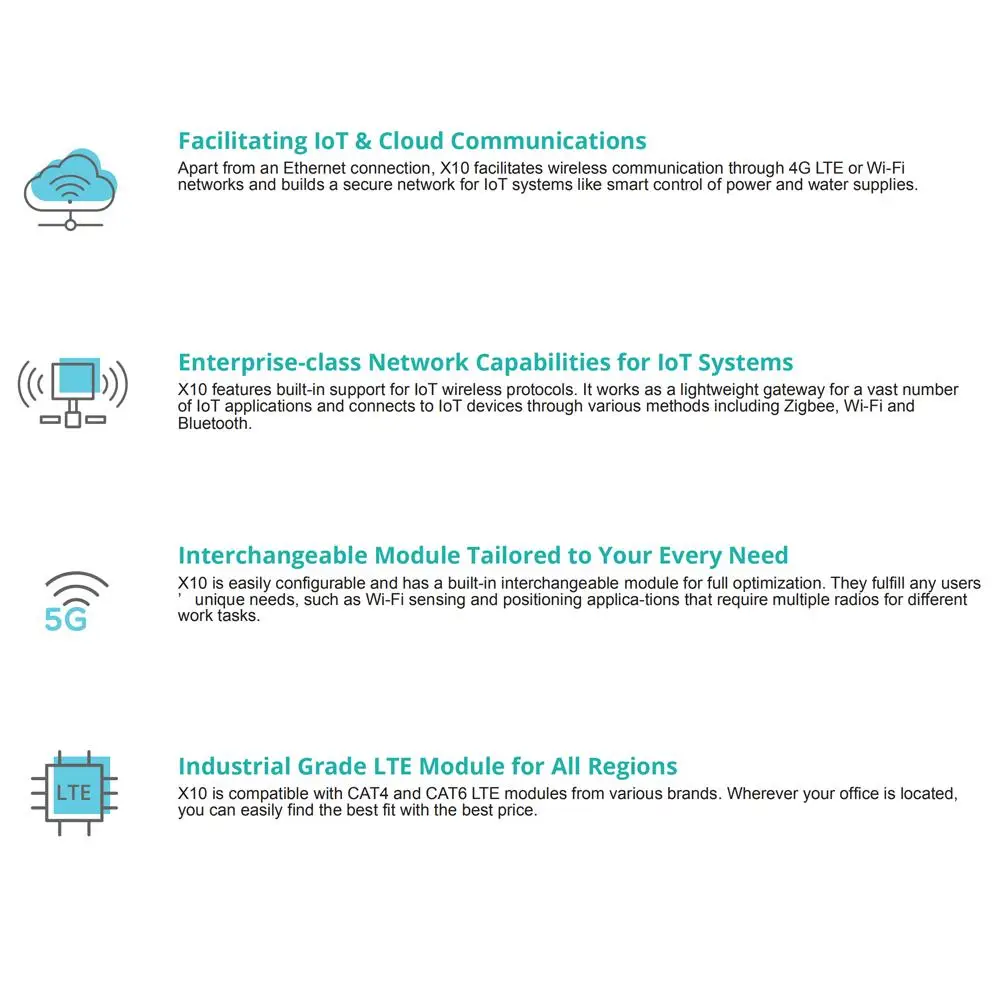 Помимо подключения к Ethernet, X10 расширяет беспроводную связь через сети 4F LTE или WiFi и создает безопасную сеть для многих систем, таких как умное управление питанием и водными ресурсами.