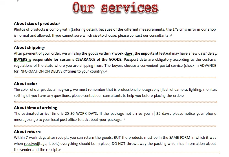 Примечание: размер в нашем магазине на 1-3 см, но он будет меньше, чем Европейский/американский размер, мы предлагаем приобрести на 1-2 размера больше, чем обычно. Если вы не уверены в размере.Пожалуйста, сообщите нам ваш вес и рост, а также информацию о талии и т. д.Чтобы мы могли помочь вам решить проблему.