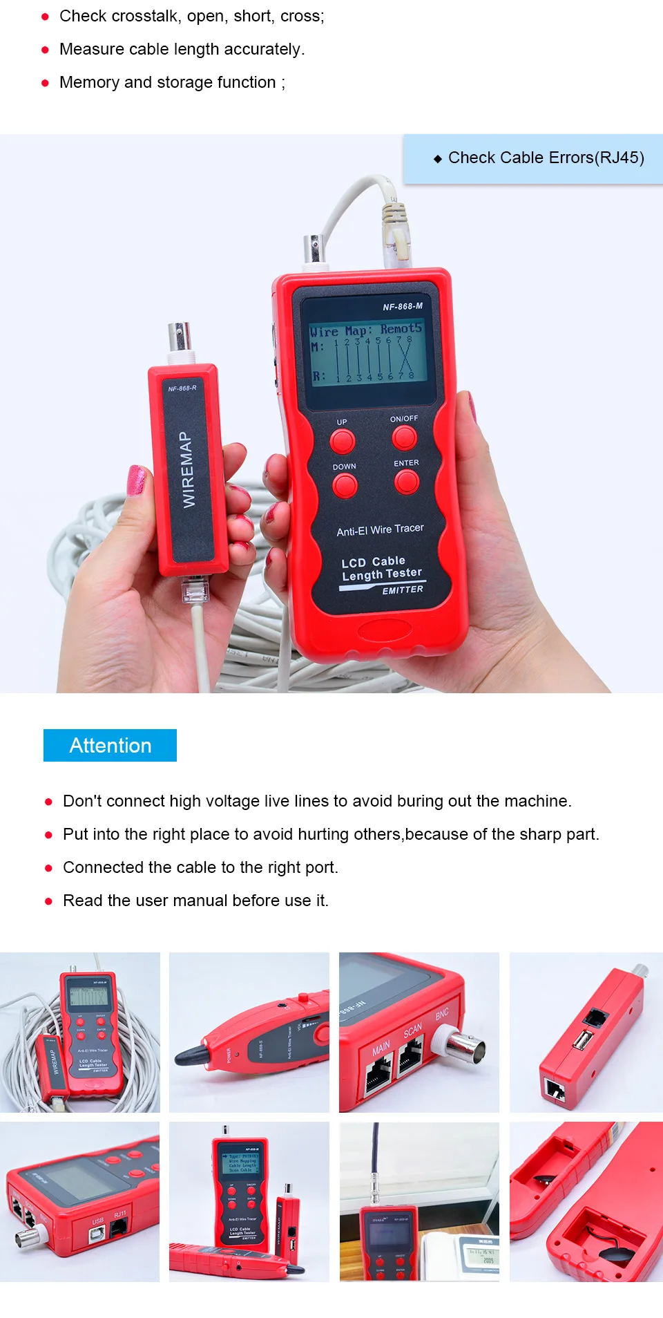 NF-868 тестер цифрового кабеля трекер для RJ45, RJ11, BNC ,USB, анти-помех металлический кабель тест перекрестный/короткого замыкания/длина