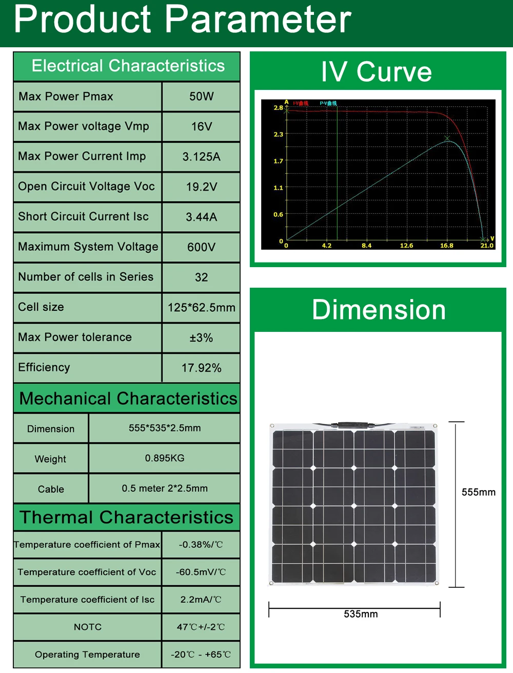 Температурный коэффициент Pmax -0.38%/℃ Температурный коэффициент Voc -60.5 мВ/℃ Температурный коэффициент Isc 2.2 мА/℃ NOTC 47 ℃ +/-2 ℃ Рабочая температура-20 ℃ - + 65 ℃