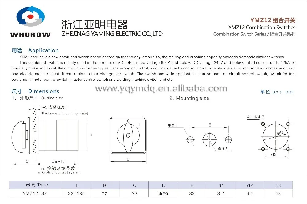 Переключатель камеры серии YMZ12Используется в цепиПеременного тока 50 Гц, Номинальное напряжение690 В и ниже, Напряжение постоянного тока240 В и ниже, Номинальный ток до125AСделать и разбивать цепь вручную не часто, какПередача или контроля, Также он может напрямую управлять двигателем с переменной емкостью, используемым в качестве основного контроля и измерения мощности, он может заменить другой выключатель переключения. Переключатель имеет широкое применение, может бытьУправление контуромПереключатель, переключатель дляИспытательное Оборудование, Управление двигателемВыключатель, основной переключатель управления иСварочный аппарат переключательИ т. д.