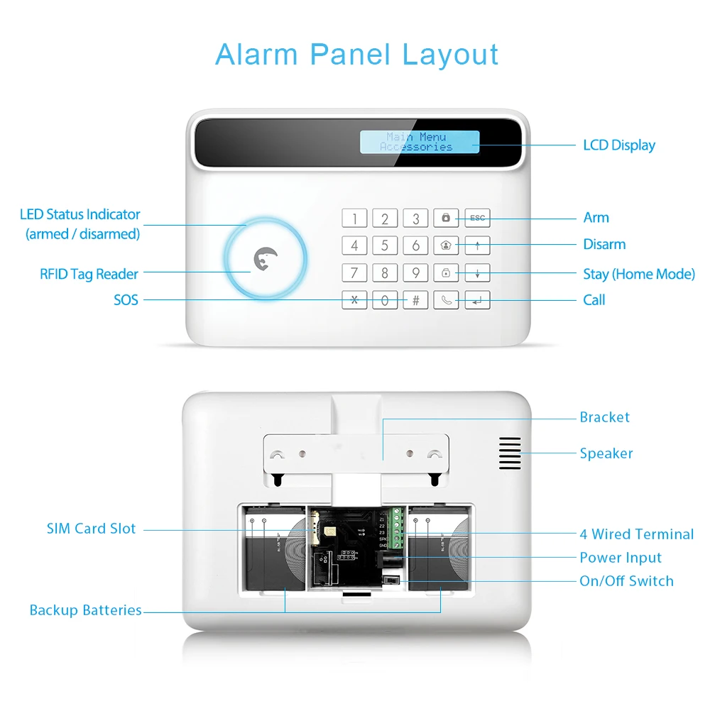 Brand NameETIGERModel NumberS4 PlusOriginMainland ChinaCertificationCEConnection TypeWirelessPowerInput: AC 110-240V / 50-60Hz Output: DC 12V / 500mASmart home platformOtherSmart home platformTuyaSmart home platformGoogle AssistantDisplayYesSize191 x 132 x 28 mm WeightZone Number30 remote controls 50 wireless accessories 50 RFID tagsOutput Number5 numbers for phone call alerts 5 numbers for SMS notifications (inclPassword KeyboardYesAlarm TypeSMSAlarm TypeThe AlarmVideo InterfaceNoArming TypePassword KeyboardKit ConfigurationDoor SensorMeasurement unitset/setsEach pack1ColorWhiteAPPEtiger Home/ Tuya SmartGSM band850/900/1800/1900mhzInternal battery backup2pcs 3.7V 800mAh lithium battery(BL-5B)Internal siren volume95dBSupported Wireless Accessories30 remote controls and 50 wireless sensorsRadio frequency433MHzSupport Phone Number5 Phone Number 5 SMS Number 2 CMS numberLanguageEnglish/French/German/Spanish/Italian/Dutch