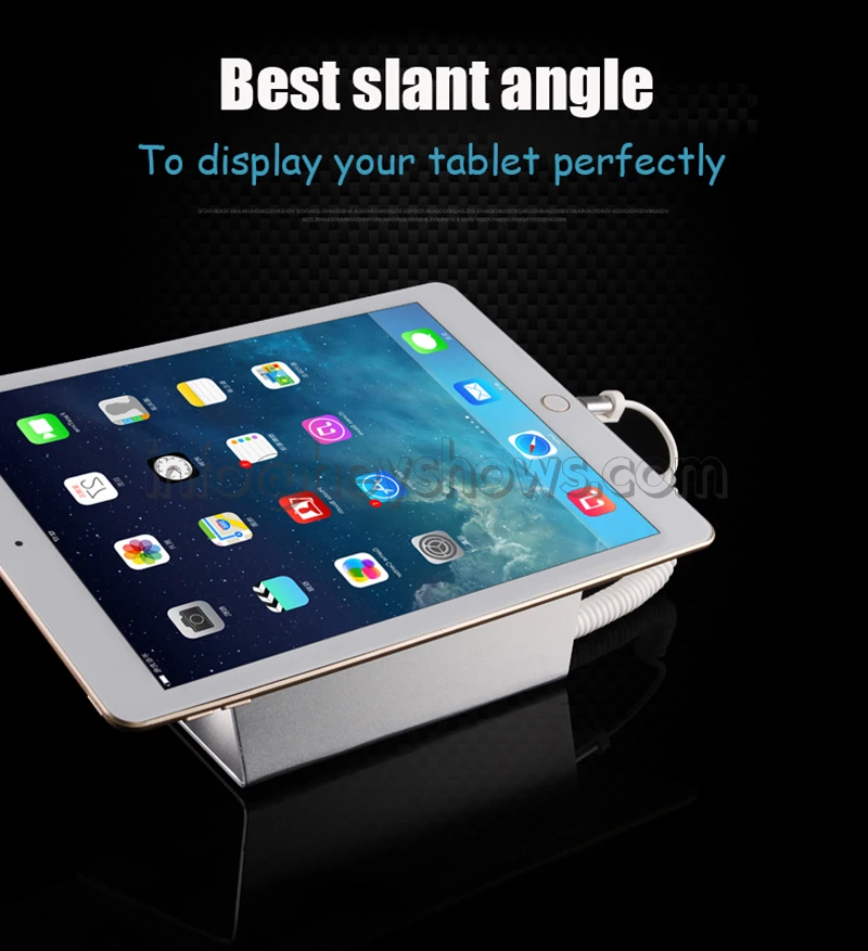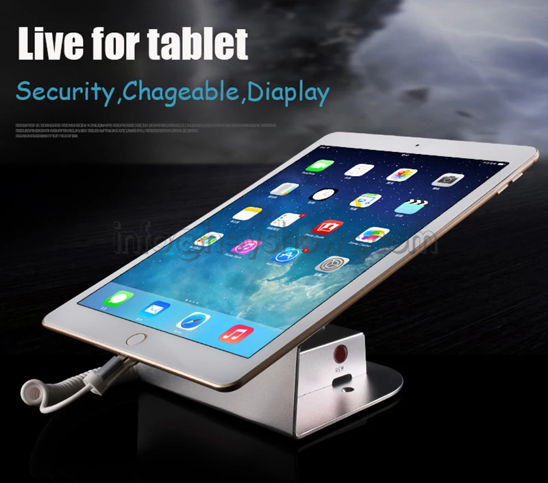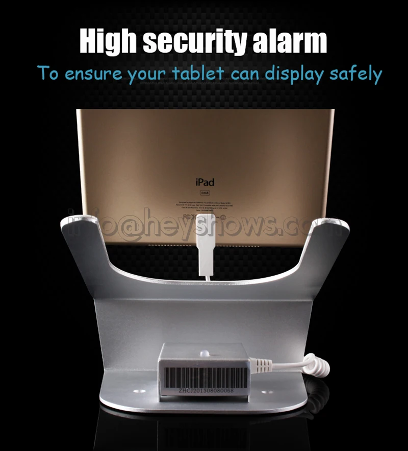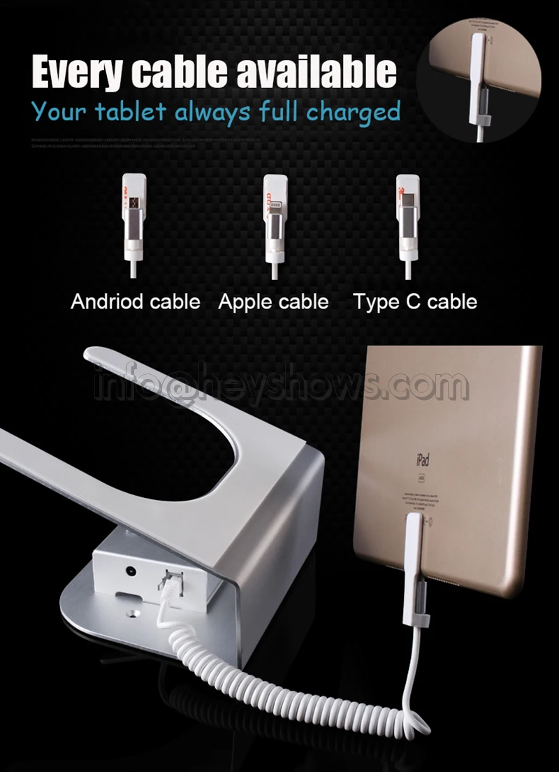 Packing list | Ipad Security Display Stand Tablet Burglar Alarm Mount Rack Anti-Theft Device Holder For Retail Shop With Charging Funtion 1. 1x tablet security stands 2. 1x Tablet charging cables 3. 1x (Adapter+ cable for host)s 4. 1x Wireless remote control |