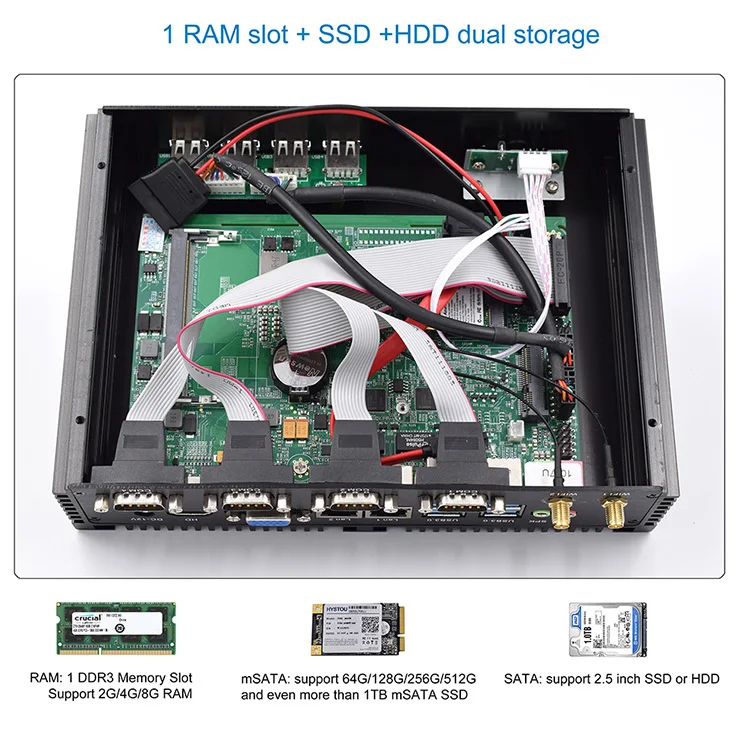 1. Материал корпуса-алюминиевый сплав. 2, ЦП может быть Intel Core i5-3317,Celeron 1037U,Celeron 1007U для опций. 3,2 * Intel 82574L гигабитное сетевое соединение. 4,VGA + HDMI дисплей. 5,4 * RS232 Com порт.
