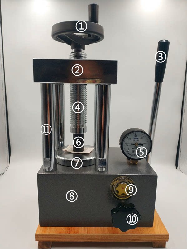 1. Свинцово-винтовое ручное колесо; 2. Верхний луч; 3. Кривошип давления; 4. Свинцовый винт; 5. Манометр; 6. Вспомогательная прокладка для доставки; 7. Крышка верстака; 8. Цельный основной корпус; 9, индикатор топливного бака; 10. Малый маховик для разгрузочного клапана масла;