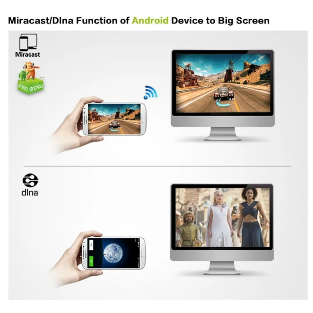 Cast your contents (Video, Game, Audio, Picture, App and File) in your Smart Phones / Tablet PC to another big screen devices with HDMI interface (such as, HDTV, Monitor & Projector, etc) by using Miracast, DLNA and AirPlay through WiFi connection. Perfectly to enjoy the ultimate big screen: Watch movies, play games, create your own exclusive cinema. Allows you to enjoy different audio-visual feast!