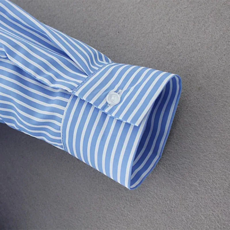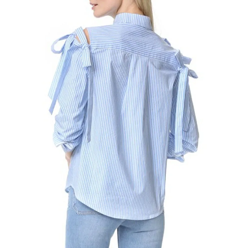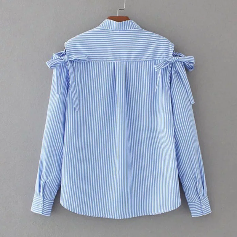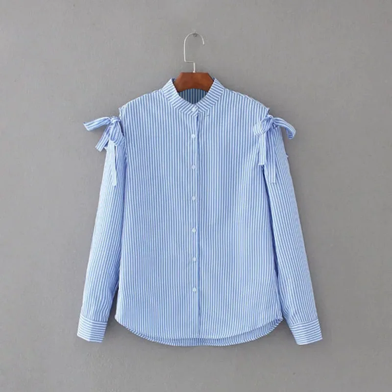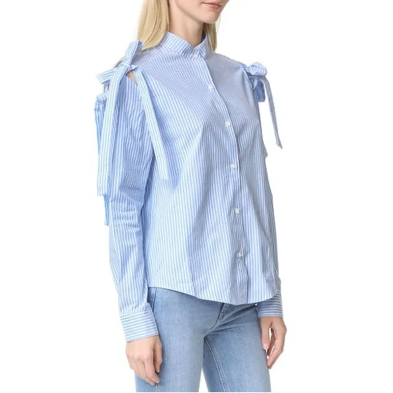 Бант узел синий полосатый 2017 новая мода однобортная блузка, яркая и стильная,