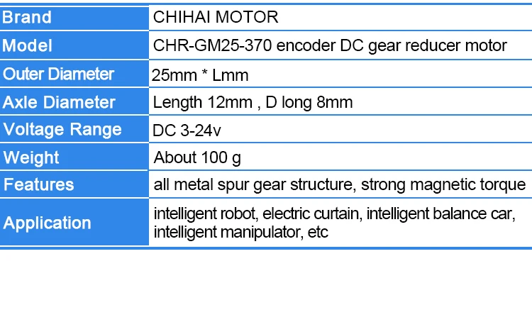 Бренд: Chihai motor Тип товара: CHR-GM25-370 постоянного магнита dc редуктор кодировщик двигателя Особенности: вся Металлическая Цилиндрическая шестерня, Сильный магнитный крутящий момент, 370 моторов Длина выходного вала: диаметр 25 мм * lмм (различное замедление разного соотношения) Диаметр оси: диаметр оси 4mmD шрифт D толщиной 3,5 мм (партии можно по запросу) Длина оси: (Партия настраивается) Вес: около 110 грамм Чехол: Интеллектуальный робот, электрический занавес, Интеллектуальный баланс автомобиля, интеллектуальный манипулятор и т. Д.
