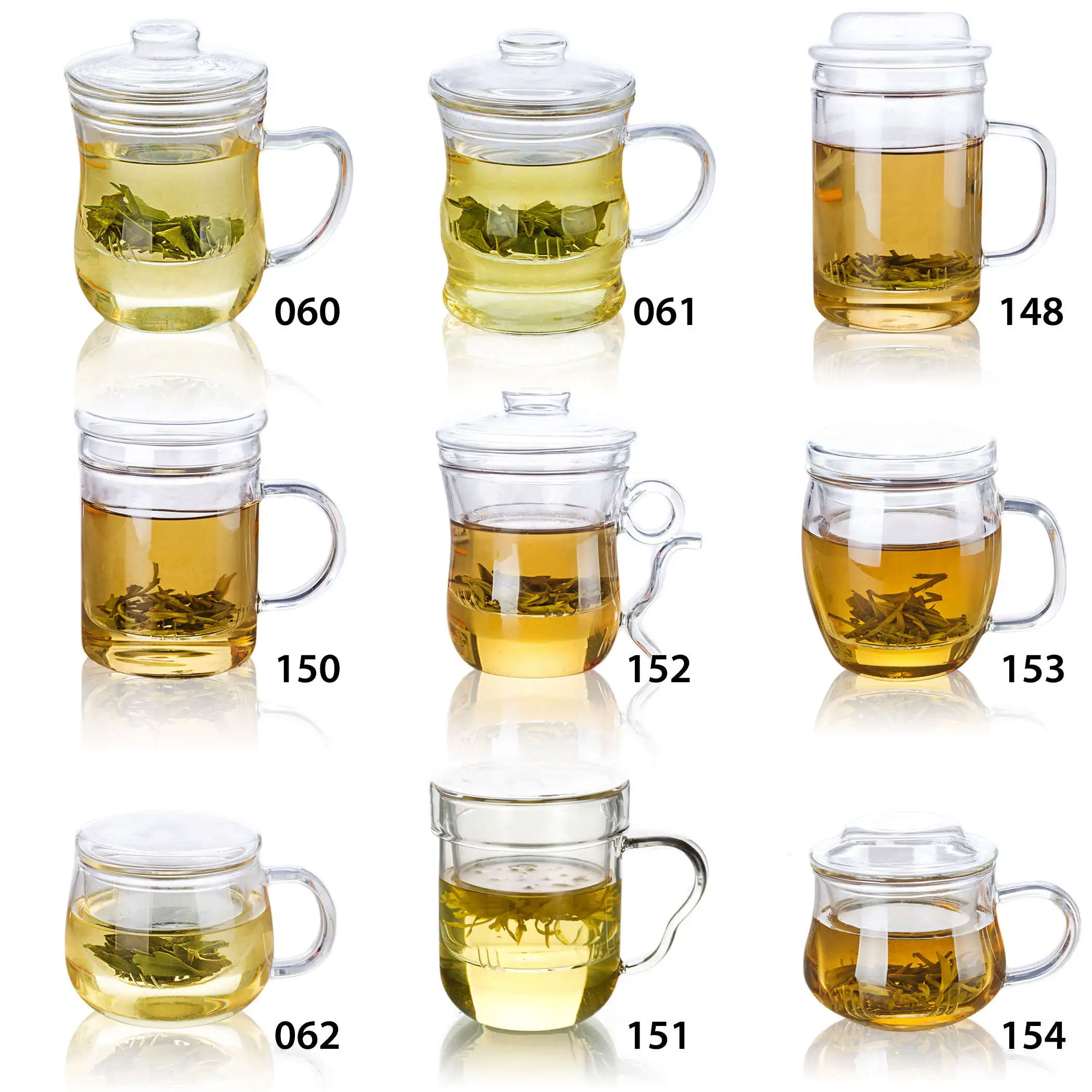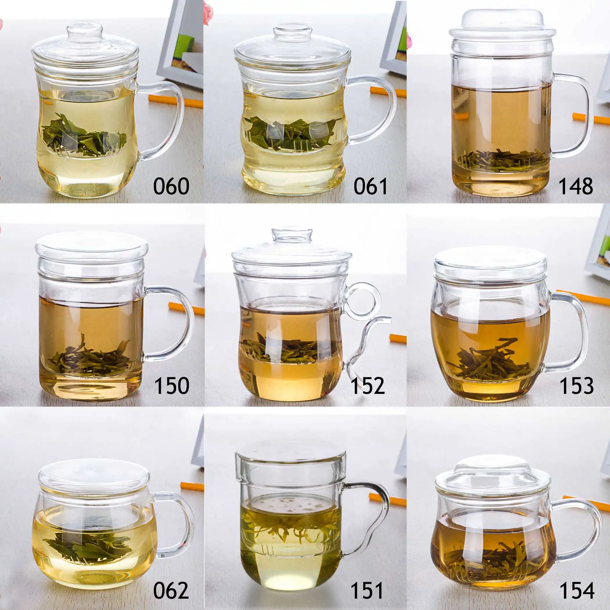 [Model: 060 370ml]370ml Bodybuilding-shaped Heat-Resisting Glass Tea Pot Water Cups with infuser with LidInclude:** 1 x 370ml Bodybuilding-shaped Heat-Resisting Glass Teapot with infuser with Lid** 1 x PackageSpecifics:** Material: Glass** Capacity: appr. 370ml** Total Height: appr. 130mm** Top Diameter: appr. 85mm** Bottom Diameter: appr. 55mm[Model: 061 360ml]** Material: Glass** Capacity: appr. 360ml** Height: appr. 120mm** Top Diameter: appr. 80mm** Bottom Diameter: appr. 80mm[Model: 148 390ml]390ml Heat-Resisting Glass Flower Tea Pot Water Cups with infuser with LidInclude:** 1 x 390ml Heat-Resisting Glass Flower Tea Pot Water Cups with infuser with Lid** 1 x PackageSpecifics:** Type: Teacup**Product component: Lid+Inner container+Body** Color: Clear** Material: Glass** Country of Manufacture: China** Capacity: appr. 390ml** Technology: Manual blowing** Bearing temperature: Minus 20 degree Celsius-150 degree Celsius** Total Height: appr. 145mm** Top Diameter: appr. 75mm** Bottom Diameter: appr. 75mm** Max Diameter: appr. 75mm[Model: 150 400ml]400ml Heat-Resisting Glass Flower Tea Pot Cups Straight Body w/ infuser & LidInclude:** 1 x 400ml Heat-Resisting Glass Flower Tea Pot Cups Straight Body w/ infuser & Lid** 1 x PackageSpecifics:** Type: Teacup**Product component: Lid+Inner container+Body** Color: Clear** Material: Glass** Country of Manufacture: China** Capacity: appr. 400ml** Technology: Manual blowing** Bearing temperature: Minus 20 degree Celsius-150 degree Celsius** Total Height: appr. 135mm** Top Diameter: appr. 80mm** Bottom Diameter: appr. 80mm** Max Diameter: appr. 80mm[Model: 152 300ml]300ml Heat-Resisting Glass Flower Tea Pot Office Cups W/ Buckle HandleInclude:** 1 x 300ml Heat-Resisting Glass Flower Tea Pot Office Cups W/ Buckle Handle** 1 x PackageSpecifics:** Type: Teacup**Product component: Lid+Inner container+Body** Color: Clear** Material: Glass** Country of Manufacture: China** Capacity: appr. 300ml** Technology: Manual blowing** Bearing temperature: Minus 20 degree Celsius-150 degree Celsius** Total Height: appr. 125mm** Top Diameter: appr. 80mm** Bottom Diameter: appr. 60mm[Model: 153 500ml] 500ml Heat-Resisting Glass Flower Tea Pot Office Egg Body Cups W/ infuserInclude:** 1 x 500ml Heat-Resisting Glass Flower Tea Pot Office Egg Body Cups W/ infuser** 1 x PackageSpecifics:** Type: Teacup**Product component: Lid+Inner container+Body** Color: Clear** Material: Glass** Country of Manufacture: China** Capacity: appr. 500ml** Technology: Manual blowing** Bearing temperature: Minus 20 degree Celsius-150 degree Celsius** Total Height: appr. 110mm** Top Diameter: appr. 90mm** Bottom Diameter: appr. 65mm[Model: 062 430ml]430ml Round Heat-Resisting Glass Teapot Water Coffee Cups w/ infuser & LidInclude:** 1 x 430ml Round Heat-Resisting Glass Teapot with infuser with Lid from China** 1 x PackageSpecifics:** Material: Glass** Capacity: appr. 430ml** Height: appr. 85mm** Top Diameter: appr. 85mm** Bottom Diameter: appr. 100mm[Model: 151 375ml]Small 375ml Heat-Resisting Glass Flower Tea Pot Office Cups W/ Ear HandleInclude:** 1 x Small 375ml Heat-Resisting Glass Flower Tea Pot Office Cups W/ Ear Handle** 1 x PackageSpecifics:** Type: Teacup**Product component: Lid+Inner container+Body** Color: Clear** Material: Glass** Country of Manufacture: China** Capacity: appr. 375ml** Technology: Manual blowing** Bearing temperature: Minus 20 degree Celsius-150 degree Celsius** Total Height: appr. 105mm** Top Diameter: appr. 80mm** Bottom Diameter: appr. 65mm[Model: 154 360ml]Small 360ml Heat-Resisting Glass Flower Tea Pot Office Cups w/ infuser & LidInclude:** 1 x Small 360ml Heat-Resisting Glass Flower Tea Pot Office Cups w/ infuser & Lid** 1 x PackageSpecifics:** Type: Teacup**Product component: Lid+Inner container+Body** Color: Clear** Material: Glass** Country of Manufacture: China** Capacity: appr. 360ml** Technology: Manual blowing** Bearing temperature: Minus 20 degree Celsius-150 degree Celsius** Total Height: appr. 100mm** Top Diameter: appr. 80mm** Bottom Diameter: appr. 50mm** Max Diameter: appr. 90mm |