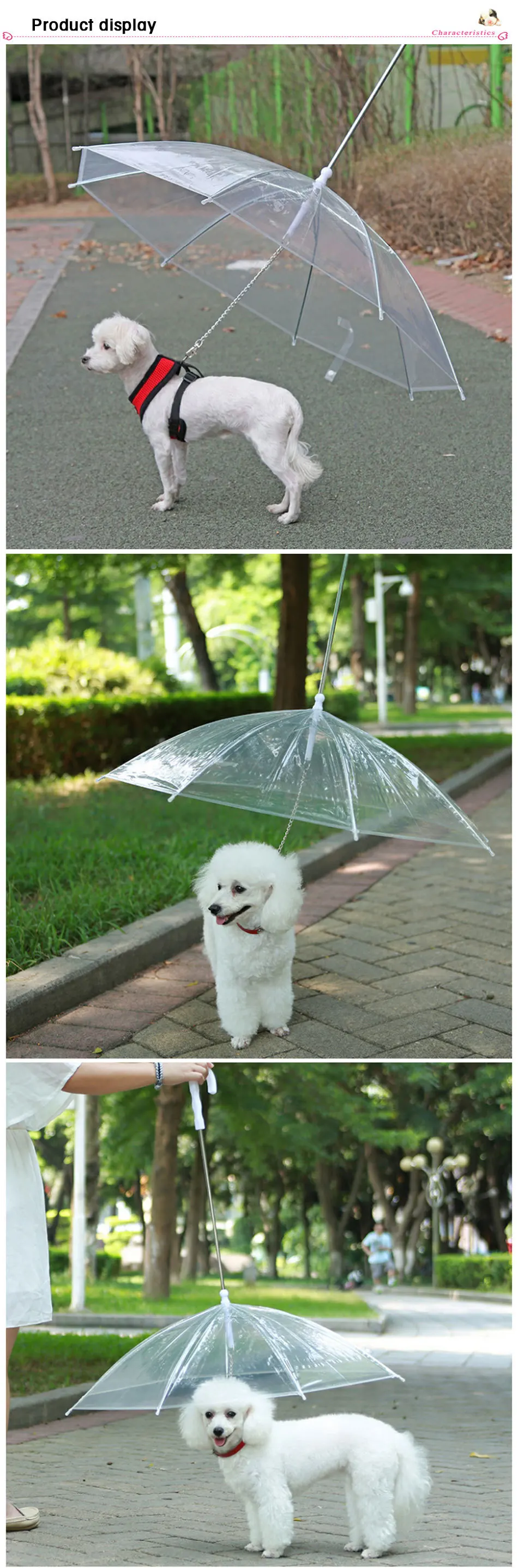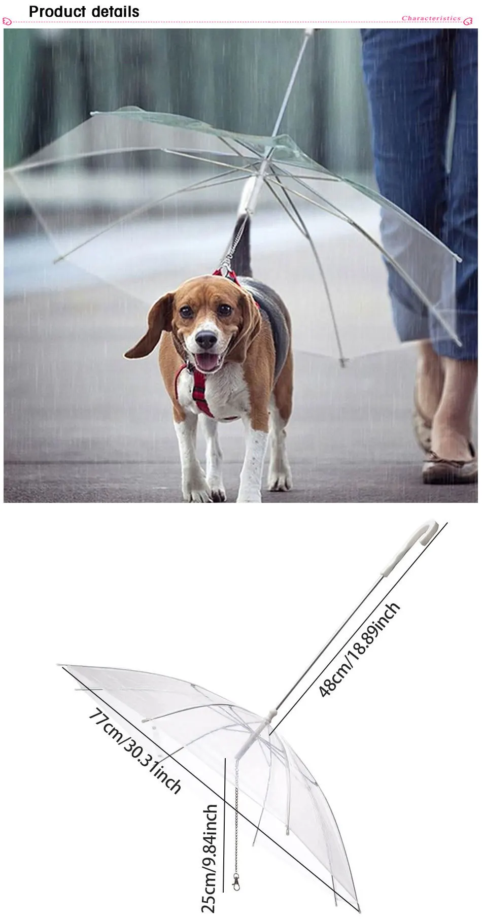 Этот зонт для домашних животных со встроенным поводком, Просто прикрепите встроенный поводок к воротнику, может держать собаку сухой, чистой и удобной в дожде, санях, снегу. Прозрачный корпус зонта удобен для просмотра вашего питомца во время ходьбы.