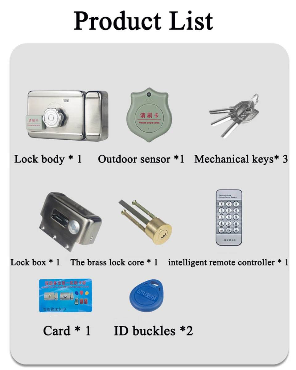 Корпус замка установлен внутри двери, и считыватель Rfid карты установлен на открытом воздухе, при необходимости, вам нужно добавить дождевой Щит к корпусу замка. Замок может работать нормально, когда питание выключено, используйте металлические ключи.