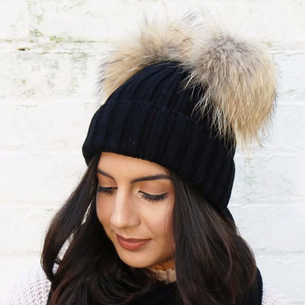 2017 двойная меховая шапка с помпонами, зимняя теплая...