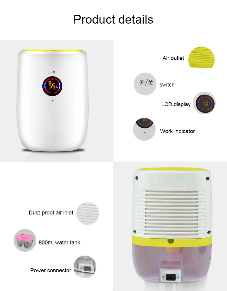 Product name: DehumidifierRated voltage: 100-240VInput voltage: 9VRated power: 25WWater tank capacity: 800mlDehumidification capacity: 200~300mlApplicable area: less than 30m2Product size: 16*14*23cm