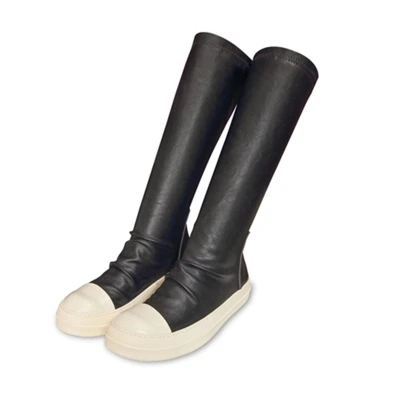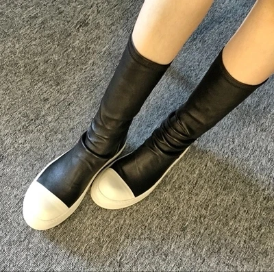 Женские сапоги на плоской подошве черные или коричневые до колена с круглым
