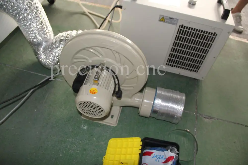 Вакуумный нагнетатель создает воздушный поток для удаления пыли и дыма из рабочей области лазерной машины. Важно удалить пыль и испарения с зоны лазерной гравировки, потому что пыль может оседать на зеркалах или линзах. Пыль на зеркалах или линзах позволит создать фокусное расстояние тепла лазера и вскоре разрушит оптику. Пары должны быть удалены из рабочей зоны оператора, потому что они могут быть раздражающими и нездоровыми. Воздуходувка также может быть подключена к вакуумной коробке, чтобы вытянуть воздух через рабочий материал.
