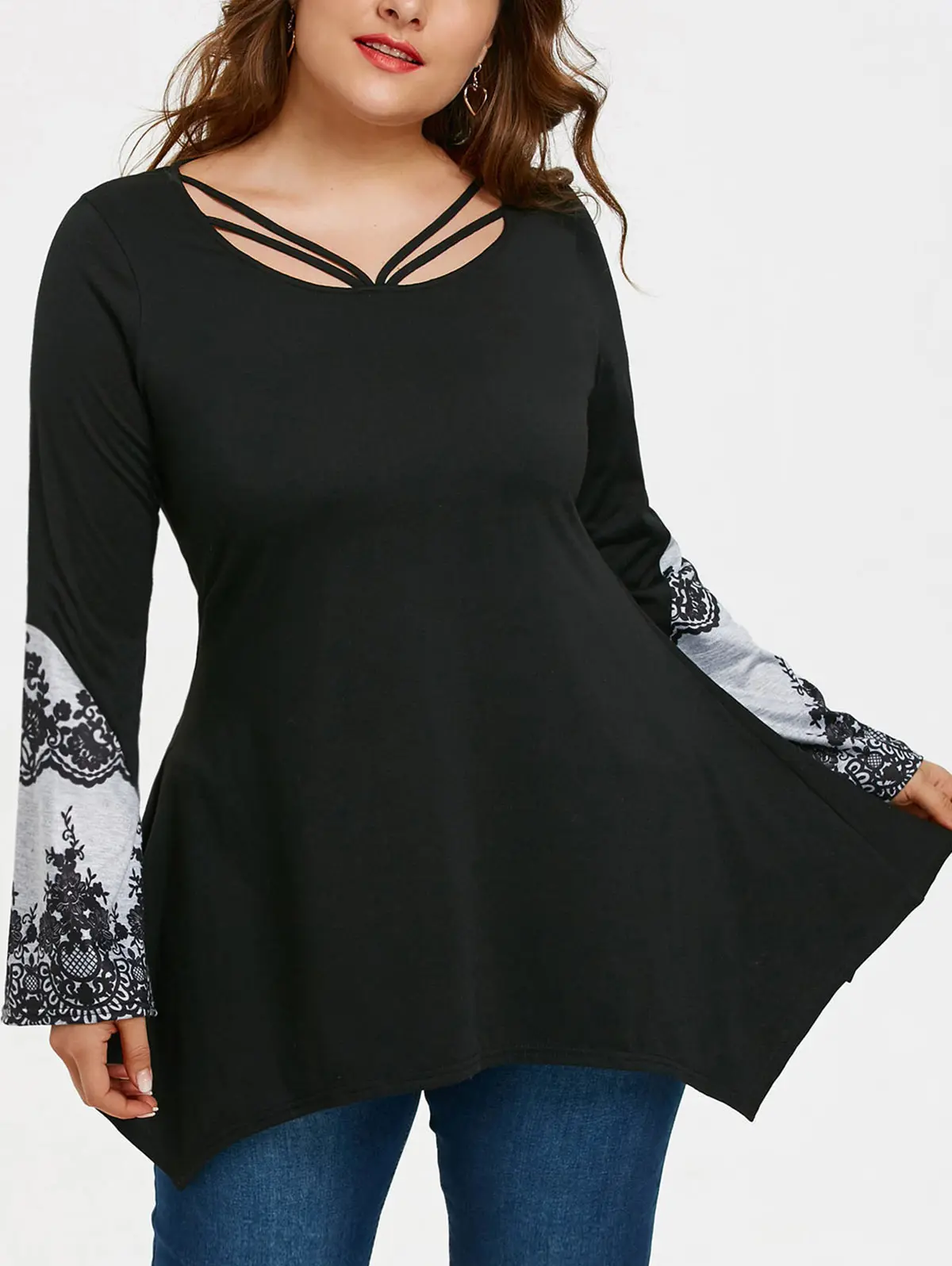 Azulina плюс размер дамы топы элегантный черный кружевной принт с решетчатой отделкой асимметричной футболки женские футболки Новая Весна Повседневная футболка