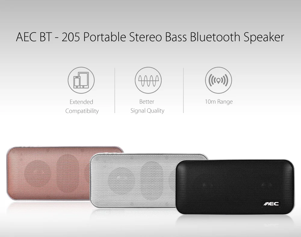 | Package Contents | 1 x AEC BT - 205 Portable Stereo Bass Bluetooth Speaker, 1 x USB Cable, 1 x Bilingual User Manual in English and Chinese |