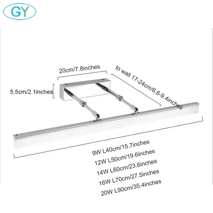 Материалы: нержавеющая сталь, акрил Вход напряжение: AC 110-240V 50/60Hz Светильник источник света: светодиодный Светодиодный индикатор включает или не включает: Мощность Потребляемая мощность: 9/12/14/16/20w Способ крепления: настенный Режим управления: настенный выключатель Площадь освещения: 10 м ^ 2 до 25 м ^ 2