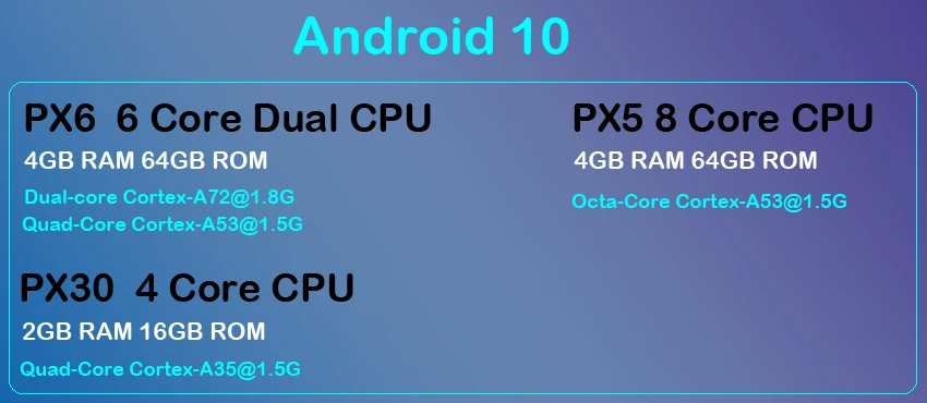 RockchipPX5/PX6/PX30Четырёхъядерный 64-разрядный процессор бит 8/4 ядра Cortex-A53/A35Структура Частота 1,5 г |