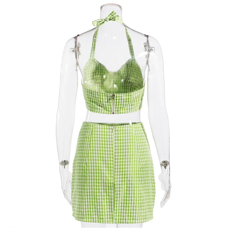 Женский комплект в клетку с высокой талией в богемном стиле, топ на бретелях с принтом + юбка с высокой талией, комплект из 2 предметов, укороченный топ, Vestidos S08201W