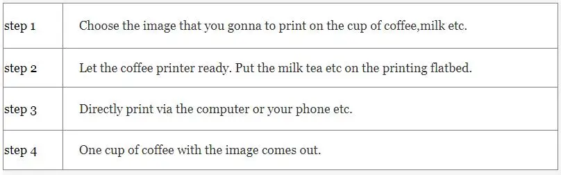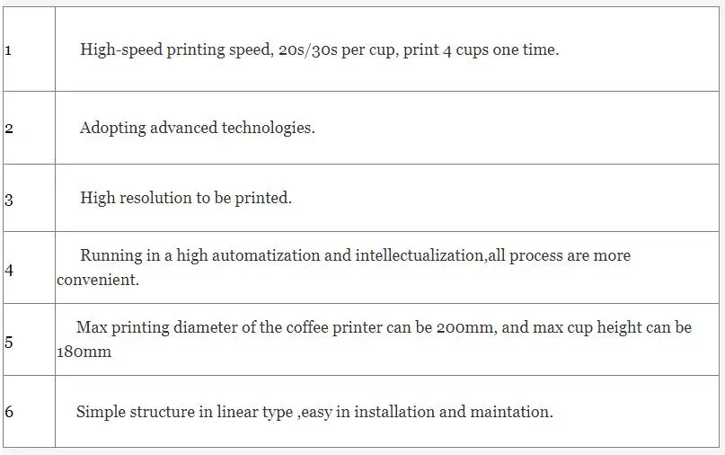 Введение для кофейного принтера с 4 чашкамиИзвестный кофе принтер позволяет вам принести свою жизнь в напиток с любым изображением вы выбираете и кофе принтер печатает изображение с помощью безвкусного красителя, который прошел строгие SGS требования к пищевообработке. С известным кофейным принтером ваш напиток-это ваш холст, на котором вы украсите свою жизнь. Кроме того, известный кофейный принтер также может печатать на других продуктах, включая торт, печенье, печенье и так далее.