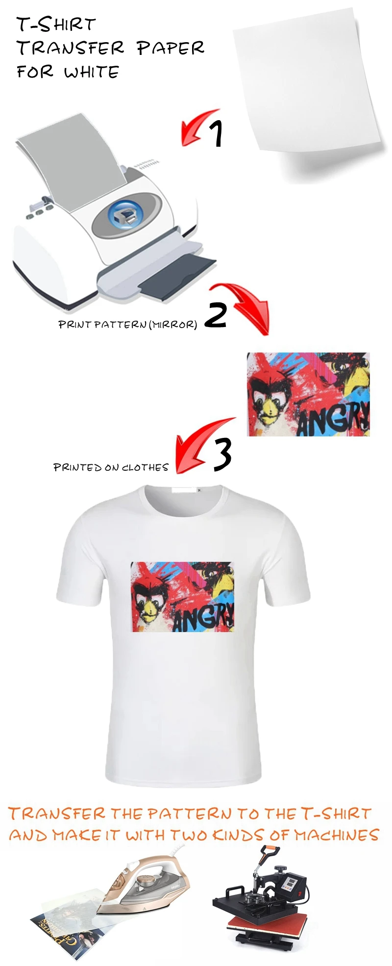 Применение: текстиль,Метод производства: теплопередачаТемпература передачи: 380 градусов по ФаренгейтуВремя передачи: 15-18 секундДавление передачи: 5 кгЗеркальное отображение выходного изображения: нетМетод пилинга: горячий пилингПрименимо: теплопередачаМатериалы: наносить на хлопок, не использовать для полиэстераЧернила: нанесение на Пигментные чернила и сублимационные чернила, использование с нашими сублимационными чернилами будет лучшеPrinter4 цвет и 6 цветов струйный принтерНанесите на футболку темного цвета (blacj \ k красный желтый голубой и т. Д....)Купите нашу бумагу для переноса, поток обработки выглядит следующим образом