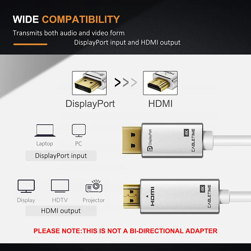 5, 99% положительные отзывыСчастье совместного использованияПодключите оборудованный DisplayPort компьютер к HDTV/монитору/проекту с выходом HDMI, чтобы вы могли поделиться содержимое на вашем компьютере на большом экране.УниверсальныйЛегко расширить второй монитор для удобной работы или шоу презентаций в школе или на работе.Надежное соединениеПозолоченный разъем обеспечивает отличную производительность сигнала.4K 30 ГцПредоставляем3840x2160(4K) @ 30 Гц видео и безупречное аудио, чтобы наслаждаться фильмом на большом дисплее дома.Примечание:1. Он может преобразовывать сигнал только из DisplayPort в HDMI. Это не двунаправленный адаптер;2. При отключении нажмите кнопку спуска на разъеме DisplayPort;3. Он поддерживает выход 1080P HD и 30 Гц, но окончательное разрешение зависит от вашего дисплея.Посылка включает в себя:1 * кабель DisplayPort-HDMIУдобный кабель напрямую соединяет DisplayPort (DP, DP + +, DisplayPort + +) оборудованный компьютер с HDTV, монитором или проектором с входом HDMIПередает аудио и видео высокой четкости с вашего компьютера на HDTV для потоковой передачи видео или игр; Подключите и настройте свой монитор для расширенного рабочего стола или зеркальных дисплеев-Позолоченные разъемы, проводники из голой меди, а также Экранирование из фольги и оплетки вместе обеспечивают превосходную производительность кабеля и надежное подключение-Разъем DisplayPort с защелками обеспечивает безопасное соединение с кнопкой релиза, которая должна быть подавлена перед отключением