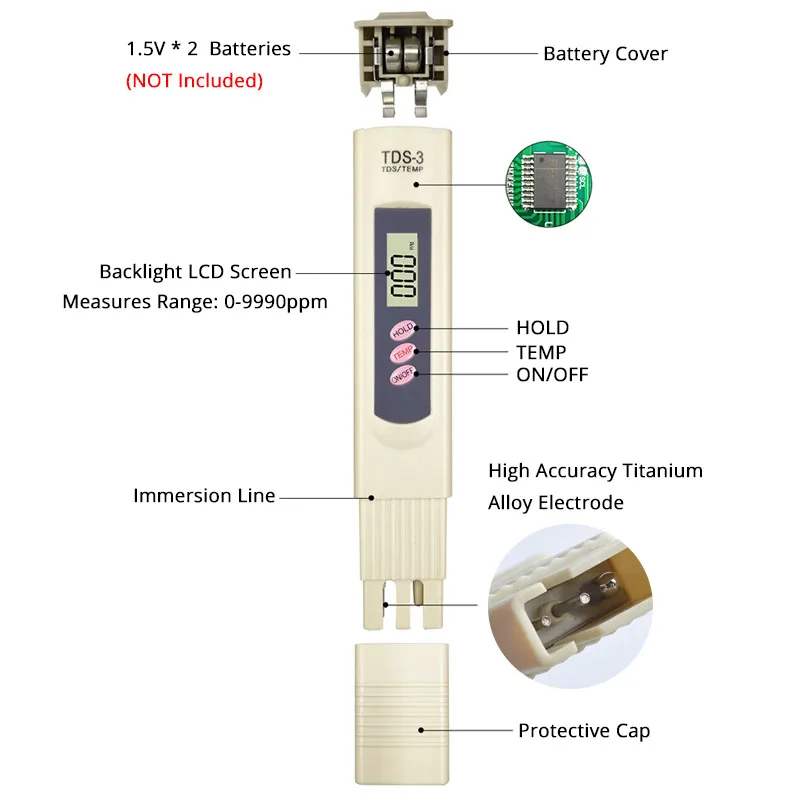 Измеритель TDS может использоваться в: очистителях и фильтрах воды, продуктах питания (овощи, фрукты) и контроля качества напитков, бассейнах и спа, аквариумах, гидропонике и т. Д.