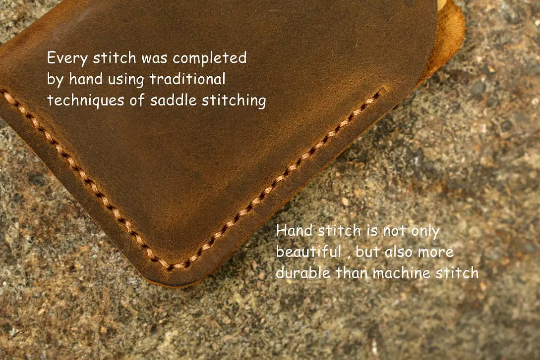 Почему мы чествуем и настаиваем на пошиве наших кожаных изделий вручную? Швейные машины для кожи обычно используют «стежок замка», если только одна петля стежка замка сломана, другая сторона автоматически будет ослаблена, часто этот процесс распаковки будет продолжен до тех пор, пока весь продукт не будет разрушен. Изделие из прошитой вручную кожи не расстегивается, если один стежок сломан из-за его специальной конструкции от седла, которая достигается только вручную! Хотя и медленнее, Ручное шитье превосходит машинное шитье. Это лучший способ Сшить кожу вместе, изделие из прошитой вручную кожи будет более прочным и выдержит испытание временем!