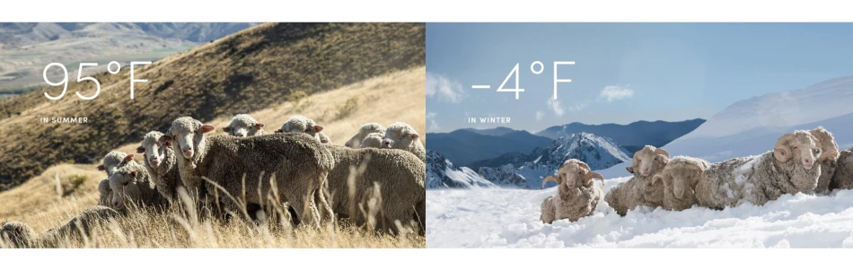 Меринос-одна из самых древних в мире пород овец. И один из самых жестких. В отличие от обычных овец, которые жуют траву в низменных землях, меринос строится для того, чтобы пережить палящее лето и холодные зимы Новой зеландской суровой Альпы. Меринос может переживать эти экстремальности из-за невероятной природной инженерии их флиса. Очень легкое и дышащее летнее пальто из мериносовой шерсти сохраняет прохладу при температуре до + 95 °F. Зимой, меринос выращивает дополнительный слой шерсти над их базовым пальто, чтобы защитить их от температур, которые опускаются до-4 °F. Мериносовая Шерсть-это очень дорогой и теплый, мягкий, удобный и прочный материал.