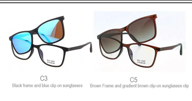 C3: черная оправа и синий зажим для солнцезащитных очков. (поляризованные) C5: коричневая оправа и градиентный коричневый зажим для солнцезащитных очков (поляризованные).