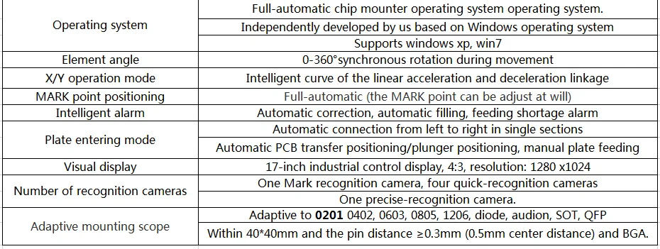 1. Машина для выбора и размещения: 1 комплект 2. Фиксированная поддержка IC: 4 комплекта (четыре винта M5 * 8, четыре винта M5 * 20) 3. Сопло JUKI: 20 шт. (502*4503*6504*6505*1) 4. Твердое сопло алибрата: 8 шт. 5. Провод питания: 1 шт. (внешний источник питания машины) 6. Фиксированная стопа: 4 шт. (три пальто) 7. Клавиатура и мышь: 1 комплект 8. Калибровка сопла inkpad:1 коробка 9. Смазка: 1 шт. 10. Промышленный ПК управления I3 (с ключом):1 комплект 11,17 дюймовый жидкокристаллический дисплей: 1 комплект (дисплей * 1, VGA линия * 1, линия питания * 1) 12. Кронштейн: 2 комплекта (Дисплей Кронштейн * 1 Кронштейн для клавиатуры и мыши * 1) 13. Конвейерная соединительная линия: 2 шт. 14. Линия регулировки параметров камеры: 1 шт. (вилка * 3) 15. Ручка: 2 шт. (M4*6 винт * 6) 16. Уплотнительное кольцо фидера: 10 шт.