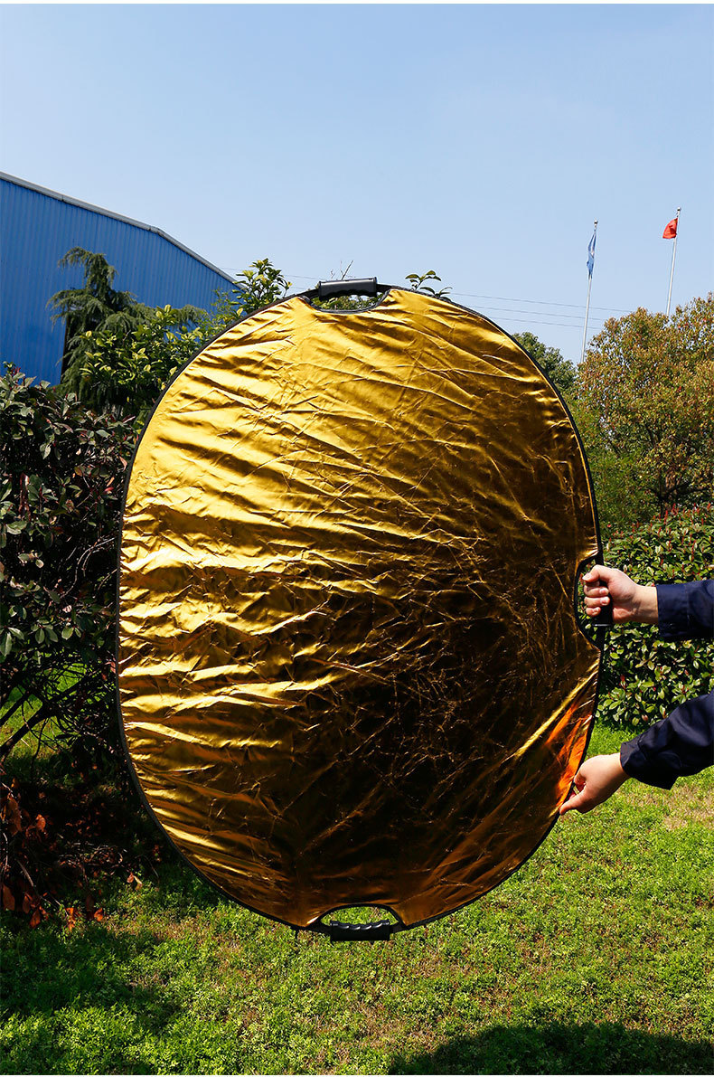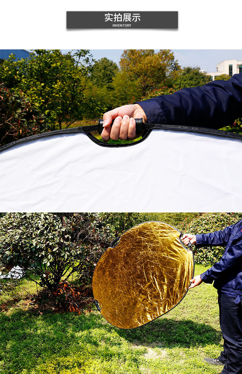 Спецификация продукта:Цвет: золотой, серебряный, белый, черный, полупрозрачныйРазмер (диаметр):60*90 смФорма: овальнаяЭффекты различных отражателей:А-серебро: ярче картинкиB- Gold: теплые огниC-черный: уменьшение избыточного освещенияD-белый: Добавьте свет в тениE-прозрачный цвет: смягчающий светОсобенности продукта:5 в 1 Портативный и складнойОтражатель с пятью различными отражающими поверхностями может использоваться для заполнения, отражения, рассеивания, поглощения илиСмягчающий светильник.Прочный и гибкий стальной каркас, его можно легко сложить в небольшой размер.В комплект входит двойной чехол на молнии для переноски.Информация об использовании продукта: