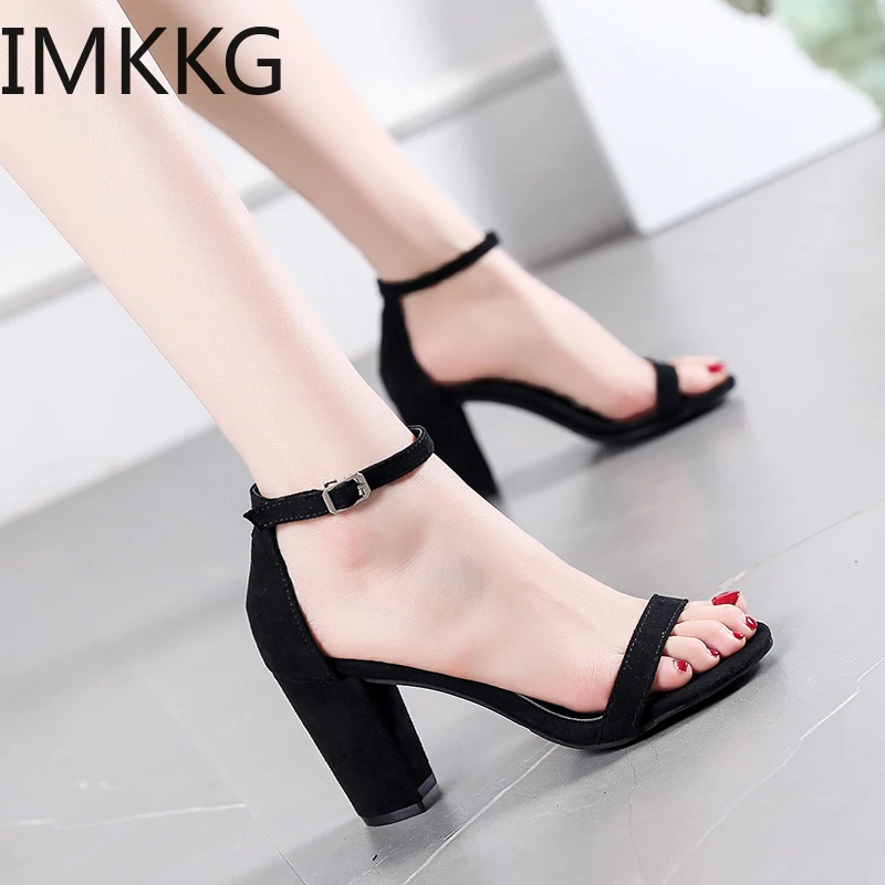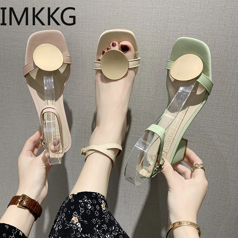 Женские босоножки на квадратном каблуке; Летняя обувь; Женские Босоножки с открытым носком на высоком каблуке с металлическими украшениями; Однотонные сандалии; 2020US $14,00