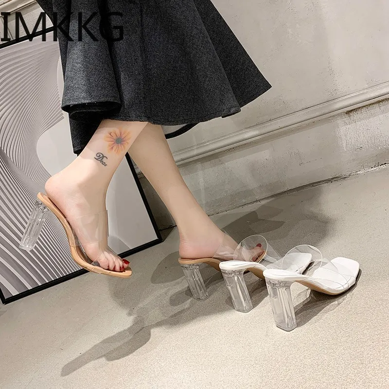 Летние женские шлепанцы из ПВХ на высоком каблуке; Прозрачные шлепанцы с открытым носком; Модная обувь; 2020US $13,80
