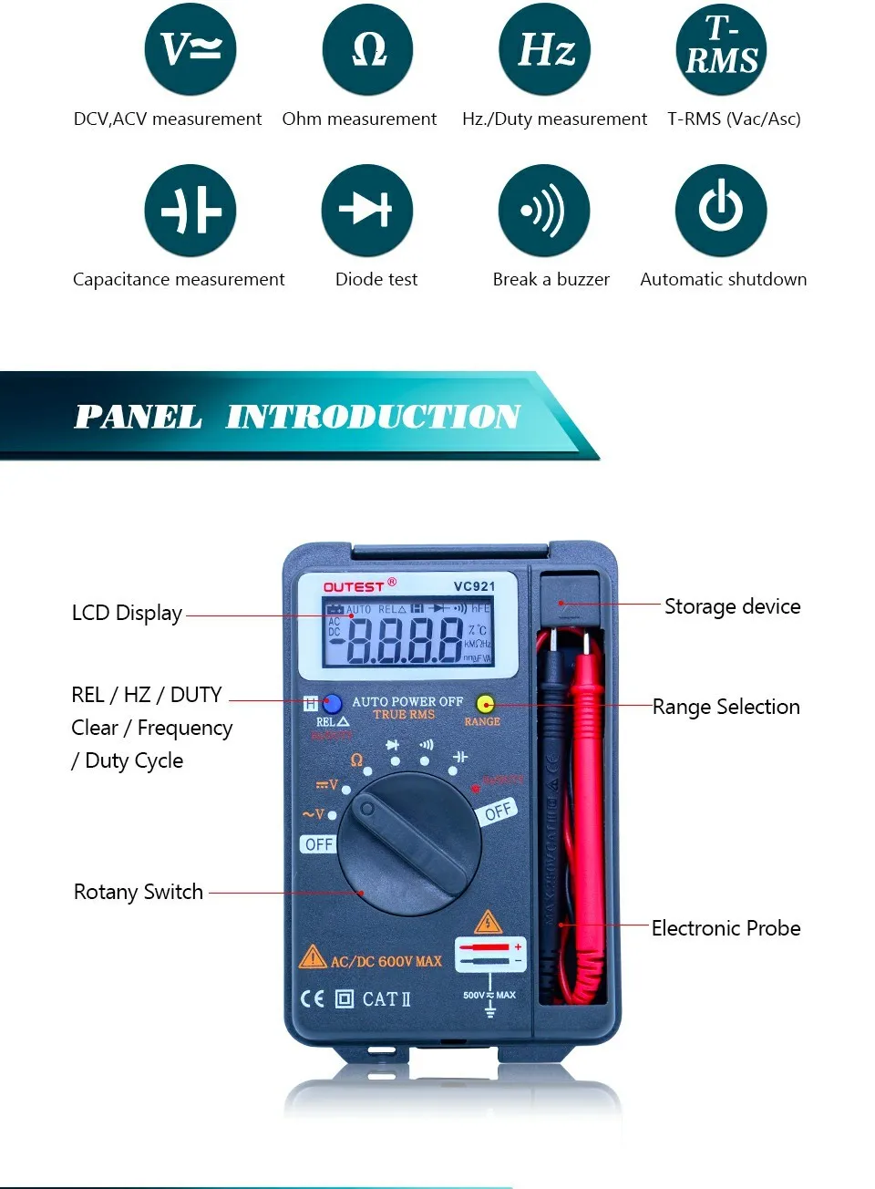 Основные измерения: напряжение переменного/постоянного тока, сопротивление, емкость, Диод и непрерывность тестирования, частота и рабочий цикл.