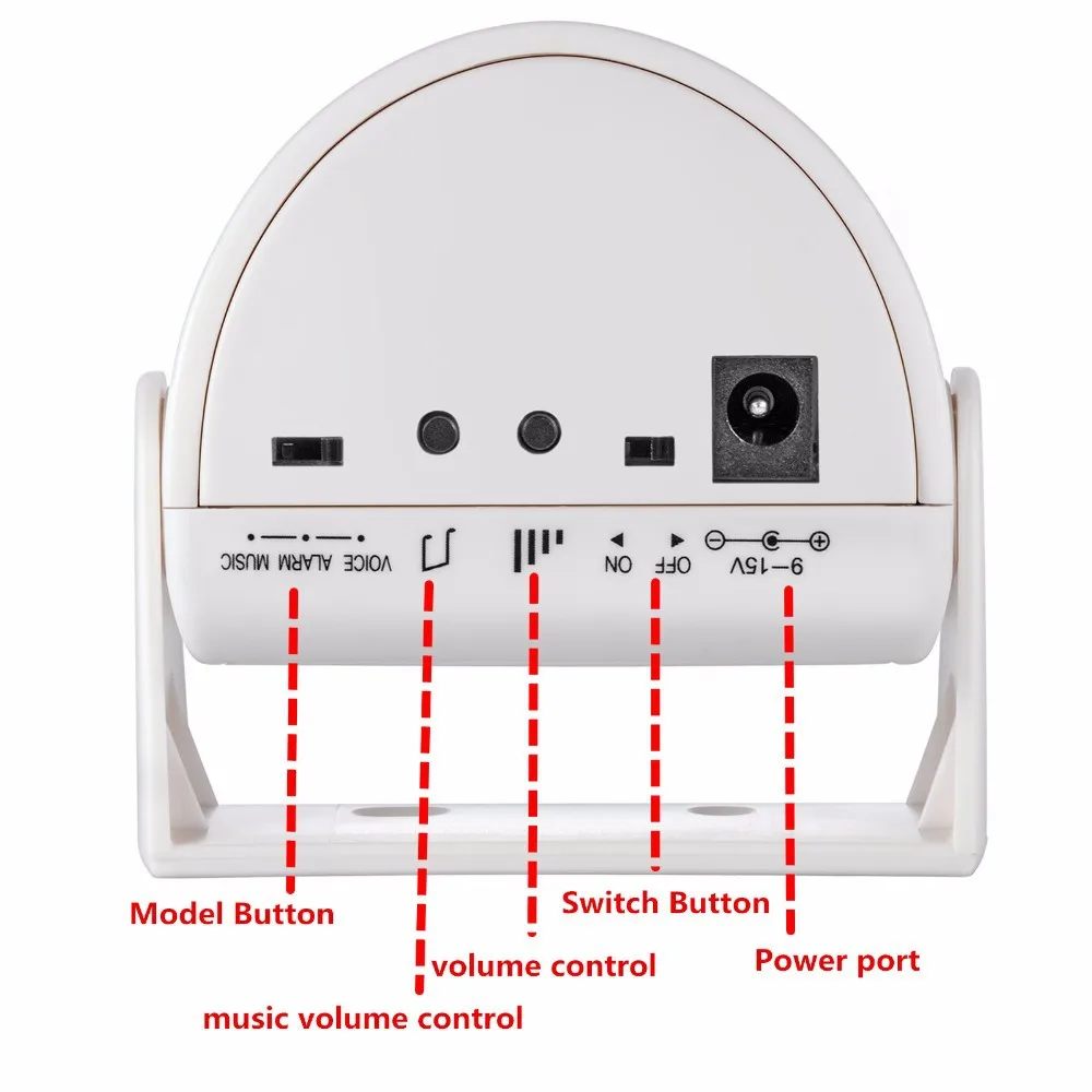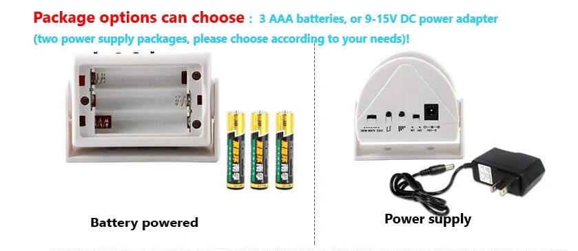 Беспроводной дверной звонок Добро пожаловать сигнал тревоги музыкальный Переключатель PIR датчик движения домашний вход в отель дверной звонок безопасности Функции и характеристики: 1. Инфракрасный датчик принимает для Цифровой нечеткой обработки, автоматической компенсации температуры, радиочастотной анти-помех, имеет низкую скорость ложной сигнализации. 2. Интеграция различных функций, добро пожаловать, беспроводной дверной звонок, защита и так далее. 3:2 выбор источника питания: 3 аккумулятора AAA и 9-15 в адаптер питания 4: поддержка человеческого голоса, 32 красивых песни и alarm5 4 уровня регулируемого звука Внимание: 1. Пожалуйста, используйте щелочные батареи хорошего качества, Избегайте использования меньшего количества электричества и электролита. 2. Непрофессиональные работники не ремонтируют без разрешения. 3, Пожалуйста, избегайте установки продукта в дождь, с длительным солнечным светом, сильным магнитным, тяжелым холодным и горячим воздухом. Конструкция силового сейфа, тройной функционал 32 Песни, компьютерный индикатор, большой диапазон инфракрасного излучения Характеристики Товара: * Источник питания: 9-15 В постоянного тока (батарея в комплект не входит) * Диапазон обнаружения: 4-8 м * Громкость: 4 уровня регулируется (не может регулировать громкость в режиме будильника) * Метод индукции: инфракрасный датчик срабатывает * 3 режима: Голосовая сигнализация, режим «Голос»: человеческий голос, dingdong,ninhao,huan ying guang ling; В режиме «Будильник»: держит вас в курсе вторжений; В режиме «Музыка»: как дверной звонок, С 32 музыкой, чтобы приветствовать ваших гостей * Температура окружающей среды/Влажность:. -10 -40 5% -95% относительной влажности * Угол обнаружения: горизонтальный угол 110 градусов, вертикальный угол 15 градусов * Основная функция: автоматическое распознавание тела, ультра-длинное, широкоугольное обнаружение. Регулируемое направление (с подставкой). Встроенные динамики, Громкость сигнала тревоги 75-95 дБ * Установка: не нужен профессиональный персонал, легко установить самостоятельно * Установка высота: 1,5 m-2,5 м * Музыка: 32 музыки и вокала необязательно * Размеры: Высота 7,5 см Ширина на каблуке высотой 8 см, толщина 4,5 см (с основанием-база может быть плоским крышам или фиксированной на верхней части) * Аккумулятор: 3 батарейки типа AAA (батарейки в комплект не входят) Технические параметры: 1, рабочий ток:<80mA2 Рабочая температура:-10- 50 ℃ Диапазон обнаружения: 4-8m4 Угол обнаружения: 110 ° 5 Установка высота: 1,5 m-2,5 m Схема установки батареи: потяните крышку аккумулятора выключателя, правильно Откройте крышку аккумулятора Посылка приветствуется дверной звонок * 1 (без батареи)