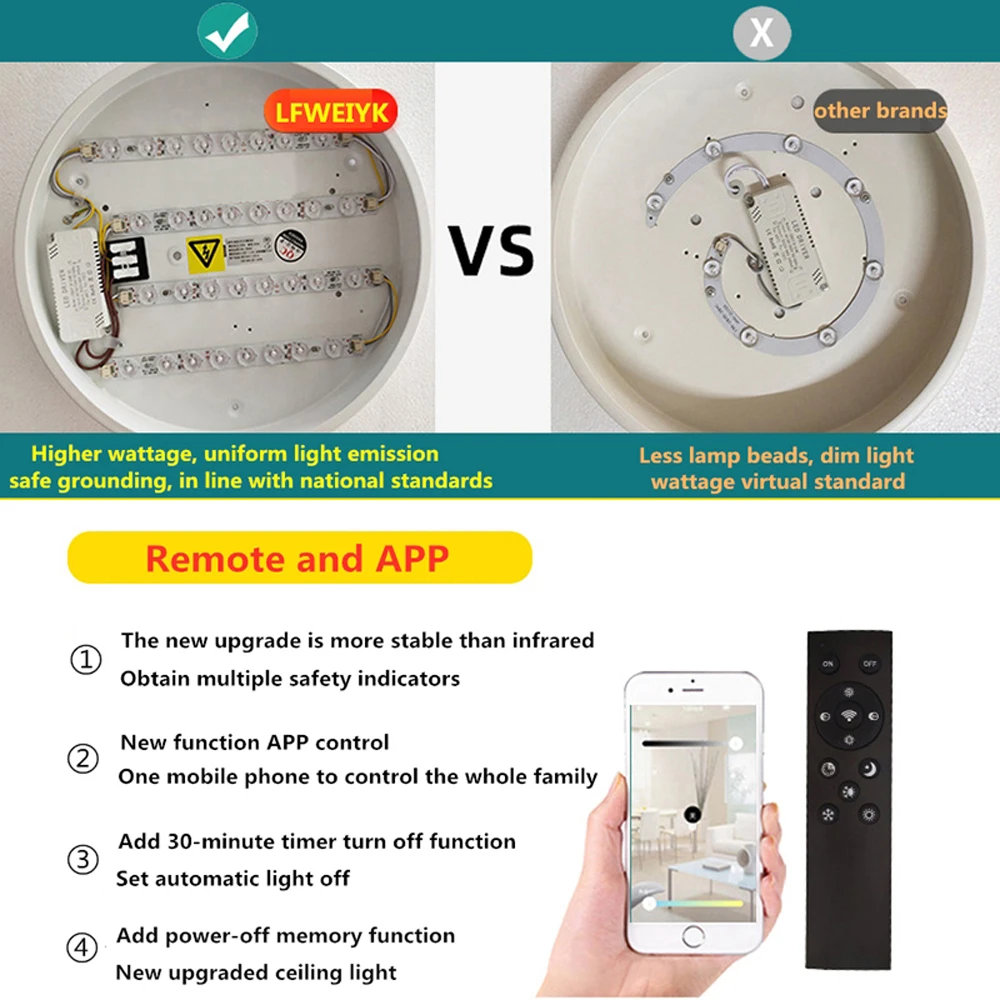 Информация о продукте: Мощность: 30 см-24 Вт/40 см-30 Вт/50 см-40 Вт Варианты цвета: [Теплый белый]: без затемнения. Только теплый белый, цветовая температура 2900-3200 к.[Холодный белый]: без затемнения. Только холодный белый, цветовая температура 6000-6500K.[Пульт дистанционного управления и приложение]: с функцией дистанционного управления. Яркость затемнения, цветовая температура изменяется. [Теплые советы]: при использовании пульта ДУ вы можете изменить яркость, лампа с регулируемой яркостью. Также вы можете изменить цветовую температуру между теплым белым, нейтральным белым и холодным белым. Между тем, вы можете включить/выключить настенный переключатель для изменения между тремя видами цветовой температуры, теплый белый, нейтральный белый и холодный белый просто. Примечание: Только RC Dimming-мобильное приложение может управляться с помощью пульта дистанционного управления и мобильного приложения