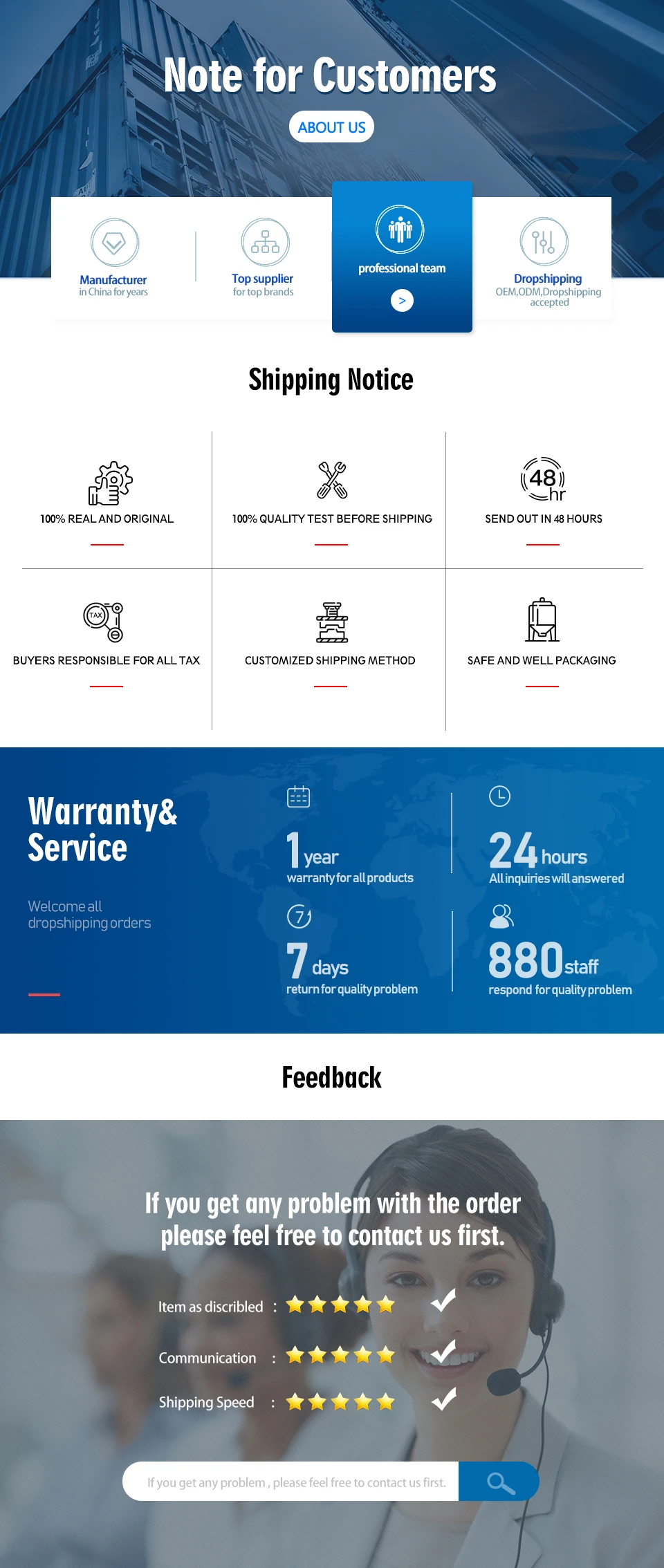 1. Мы обещаем, что эти продукты имеют 180 дней гарантии. Любая проблема качества, вы можете связаться с нами, мы можем повторно отправить его для вас бесплатно.