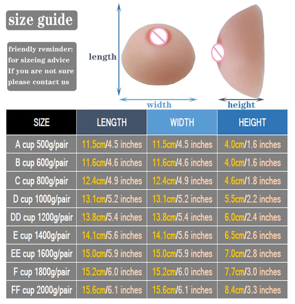 1. Какой размер чашки вы хотите? 2. Какой размер груди/бюстгальтера вы носите в см/дюймах? 3. Выберите размер в граммах, где пересекаются шаг 1 и 2. Пример: размер груди 97 см/38 дюймов и размер чашки DD, пожалуйста, выберите размер 1800 г