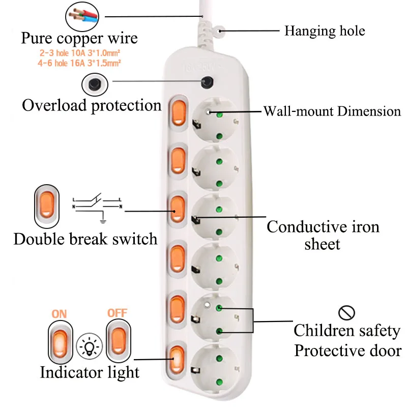 6 отверстие: 16A 3500 Вт (защита от перегрузки) Размер: S, M, L, 295*73*42 мм Длина: 1,5 м/2,5 м для соединения USB проволочный сердечник: 3*1.5mm2